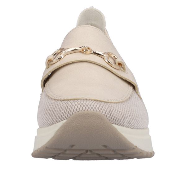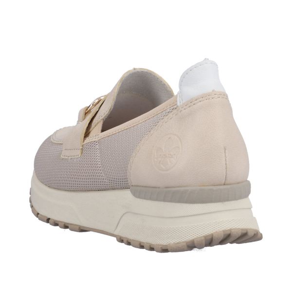 Cool, casual and up to date! You won't want to take off these light beige slippers by Rieker. An elastic insert is a great simplification especially when putting on and taking off the shoe. The stylish golden metal decor is a real eye-catcher. The sole is both super light and flexible, offering a double sense of well-being at every step. The shoe has a removable insole, which is a captivating comfort feature. The comfort width G gives you more space in the shoe. Wait for what?