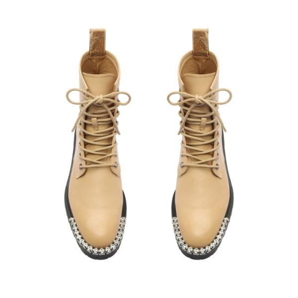 Set on a chunky sole, this patent leather combat boot is on-trend with front rhinestone details. We especially love the contrast of this tough-chic design paired with a feminine dress.