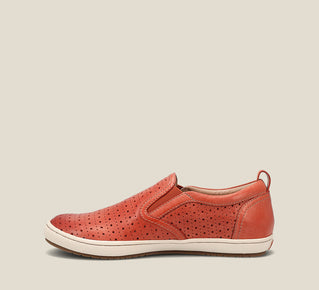 Any day is a glorious one when Court is on your feet. This slip-on sneaker features easy on/off comfort from twin gore adjustability and heel pull tabs. The Curves and Pods premium removable footbed provides outstanding comfort and incredible arch support to get you through the day, while the rich leather upper and intricate perforations design get you noticed.