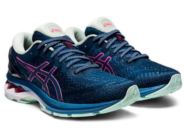 Enjoy excellent comfort and advanced support with the GEL-KAYANO 27 running shoe. The redesigned mesh upper helps keep feet cool, while the sole is more flexible to help promote a more natural roll through the gait cycle. This process starts in the heel with added flex grooves that isolate the initial impact to force a softer and smoother feeling at footstrike. At midstance, the foot should stop pronating and re-supinate for an efficient toe-off. This shoe also incorporates DYNAMIC DUOMAX technology to help support the foot and increase stability for runners whose feet roll inward too much (overpronate). The midsole integrates SPACE TRUSSTIC technology, which provides stability and reduces the overall weight to help promote a smoother transition from footstrike to toe-off. This added stability is complemented by deeper forefoot flex grooves that create a smoother roll through toe-off, allowing the shoe to move more naturally with the foot. Lastly, a large section of reflective materials in the rearfoot helps keep runners visible when running in low-light conditions. The GEL-KAYANO 27 model is an excellent choice for both competitive and non-competitive runners looking for an everyday trainer that combines comfort with support.